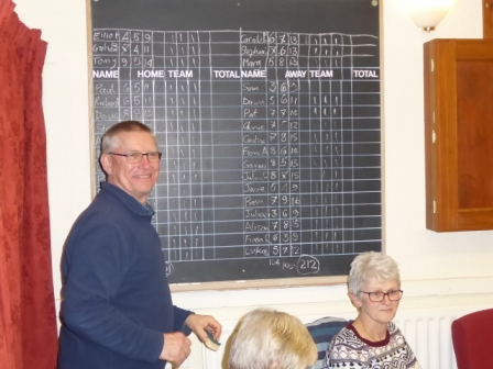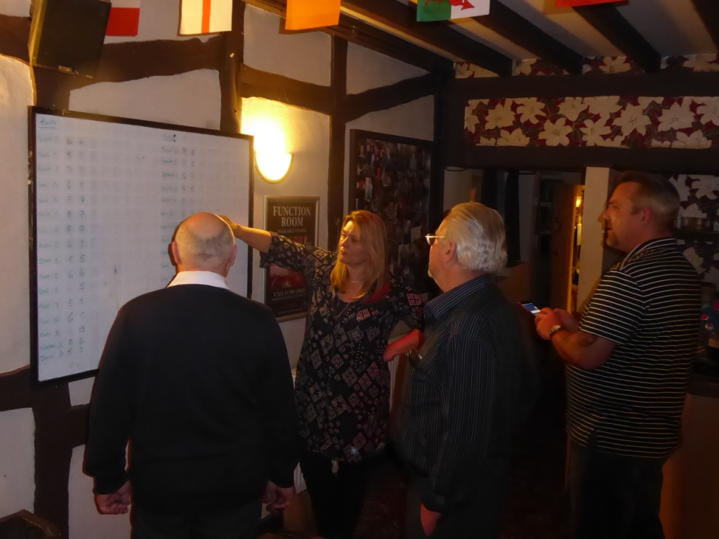 Individual winners were again Caroline Phipp (playing with her left hand!! Yes she is right handed) winning the ladies prize and Lex (with only 1 more point than Caroline!!!) winning the gents prize. Roger Phipp kept it in the family by again winning the prize for 'Killer'. As ever we have to award the 'Wooden Spoon' which this time was taken home by Pam. Well done to all the winners and thank you to the Masons Arms for the fine buffett and a good evening.